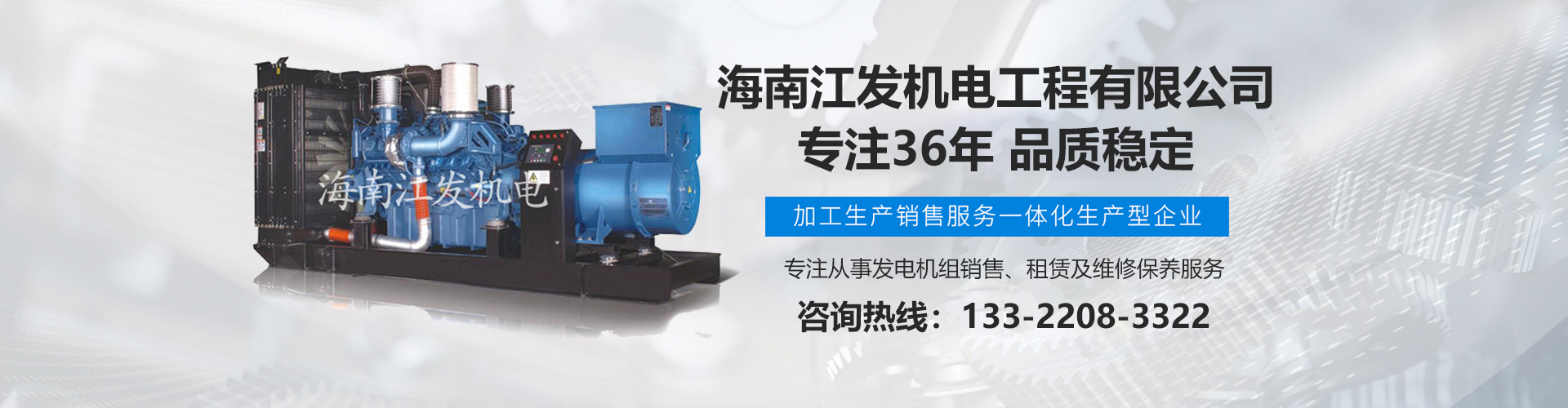 海南江發(fā)機(jī)電工程有限公司是海南經(jīng)營(yíng)進(jìn)口、國(guó)產(chǎn)柴油發(fā)電機(jī)組、是海南較早、較大的銷(xiāo)售、租賃服務(wù)及維修保養(yǎng)專(zhuān)業(yè)機(jī)電公司。從1985年開(kāi)始,公司勵(lì)精圖治、銳意進(jìn)取、不斷創(chuàng)新,不僅在海南機(jī)電行業(yè)領(lǐng)域中具有先進(jìn)技術(shù)、完美管理、誠(chéng)信服務(wù),高超的產(chǎn)品質(zhì)量和性能,而且還有合理的產(chǎn)品性能價(jià)格比,令客戶(hù)滿(mǎn)意以及完善的支持保障。 在客戶(hù)心目中,江發(fā)公司不僅具有最好的企業(yè)信譽(yù),還是客戶(hù)最信賴(lài)的誠(chéng)信單位,而且會(huì)帶給客戶(hù)永遠(yuǎn)的光明和豐厚回報(bào)。